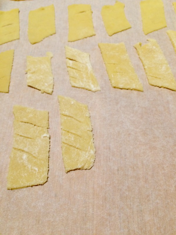 3 _Stendere finemente l’impasto e ritagliare pezzettini romboidali, alcuni dei quali potranno essere attorcigliati al centro su se stessi a mò di nodo, e poi spennellare con del latte fresco;