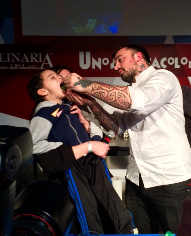 Ovviamente stupisce ancora Gabriele Rubini, in arte Chef Rubio: unto e bisunto, bello e dannato, crude e crudele nella preparazione di piatti raffinati dagli accostamenti azzardati ma azzeccati, come il cono di perilla con amaranto, crema di zucchine, anacardi, yogurt ed una manciata croccante di uova di salmone. Lui che parla come mangia; lui che non è in grado di perdere il suo savoir-faire neanche quando parla del ruolo dell’olio di soia nel prevenire i tumori alla prostata; lui che imbocca con dolcezza arrogante i bambini; lui che, colmo d’emozione e con voce a tratti tremolante, si fa portavoce di “Vite coraggiose_Fondazione Ospedale Bambin Gesù onlus” nella promozione di una cucina di qualità all’interno degli ospedali e soprattutto a portata dei più piccoli. E poi un selfie con lui e fatto da lui vale molto più dell’assaggio di mille dei suoi buonissimi piatti!
