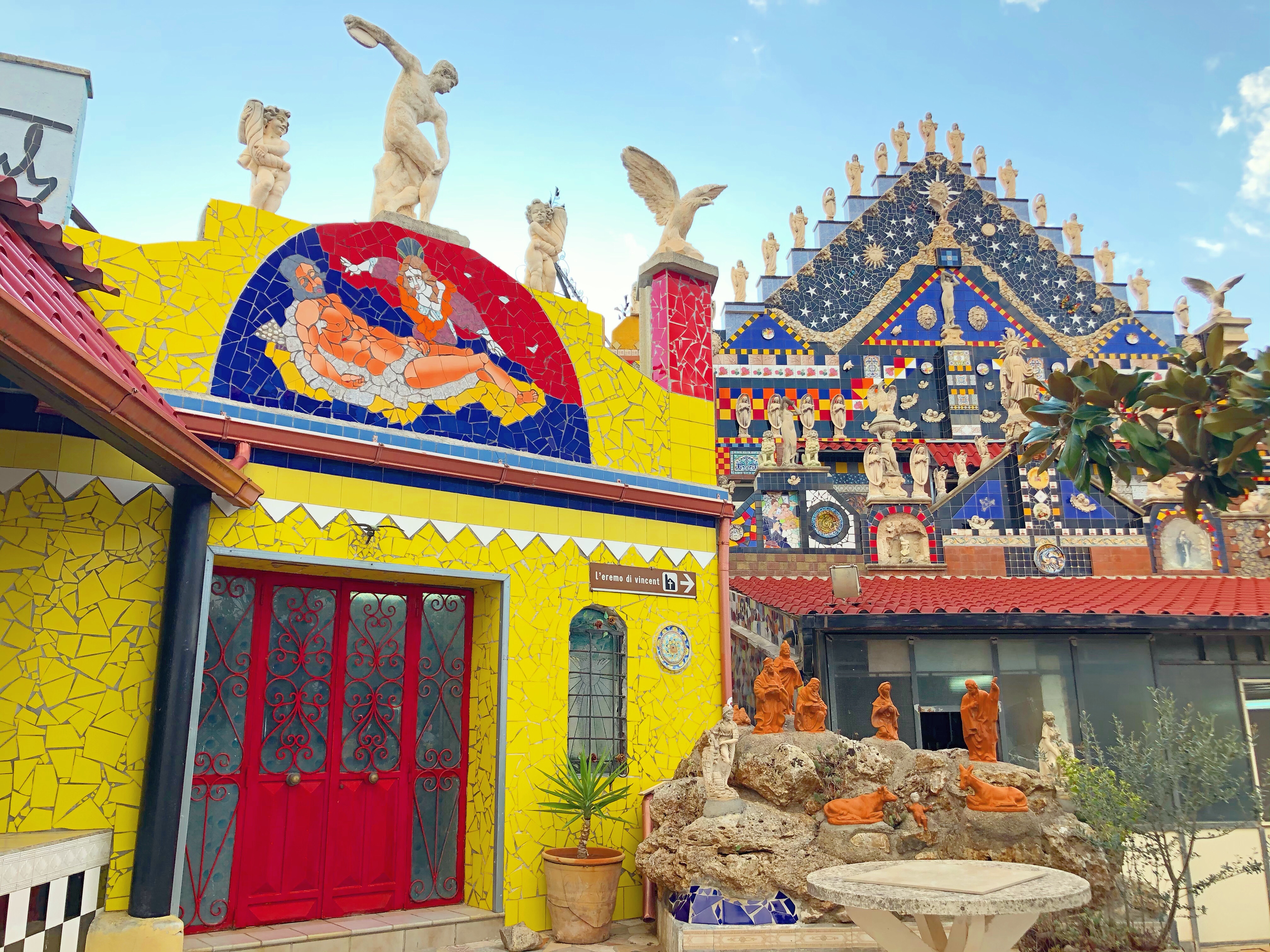 A Guagnano, a pochi chilometri da Lecce, nel cuore del Salento, tra i feudi in cui prolifera il negroamaro, trova luogo una colorata oasi di felicità, pregna di rivestimenti cromatici, di statue eclettiche, di dipinti dai toni accesi: è l’Eremo di Vincent Brunetti, la vivacissima casa di un artista locale sui generis che ha fatto della propria vita un’opera d’arte.
