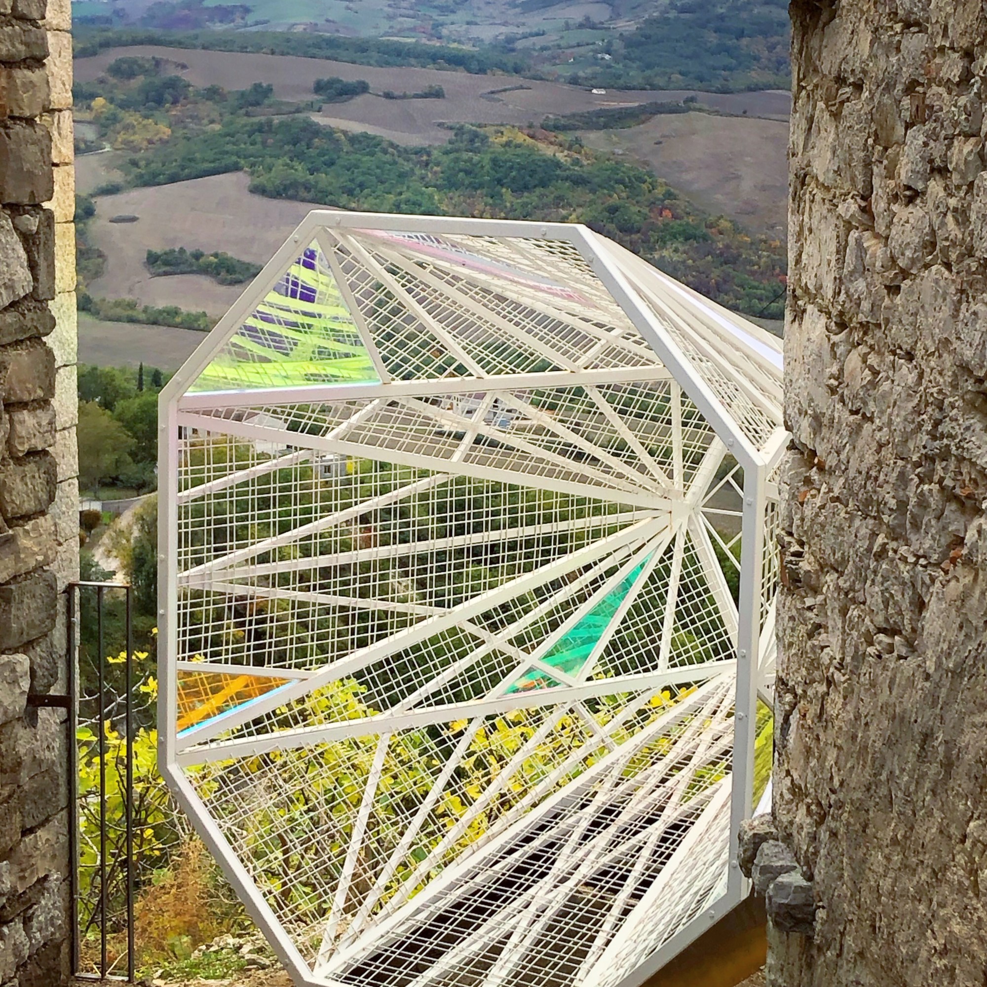 Proseguendo lungo il breve tratto percorribile, ci si imbatte in Kaleidoscope di Vincenzo Marsiglia, “una grande cellula affacciata verso il nuovo insediamento urbano che invita lo spettatore a immergersi in sicurezza nella natura del luogo, per ammirare il panorama”. Una trama metallica generata da una stella a quattro punte che connette una porzione di terreno scosceso tra due edifici e crea un punto panoramico sicuro sul paesaggio circostante. La griglia bianca è arricchita con triangoli di vetro colorati a mezzo di una pellicola diarroica.