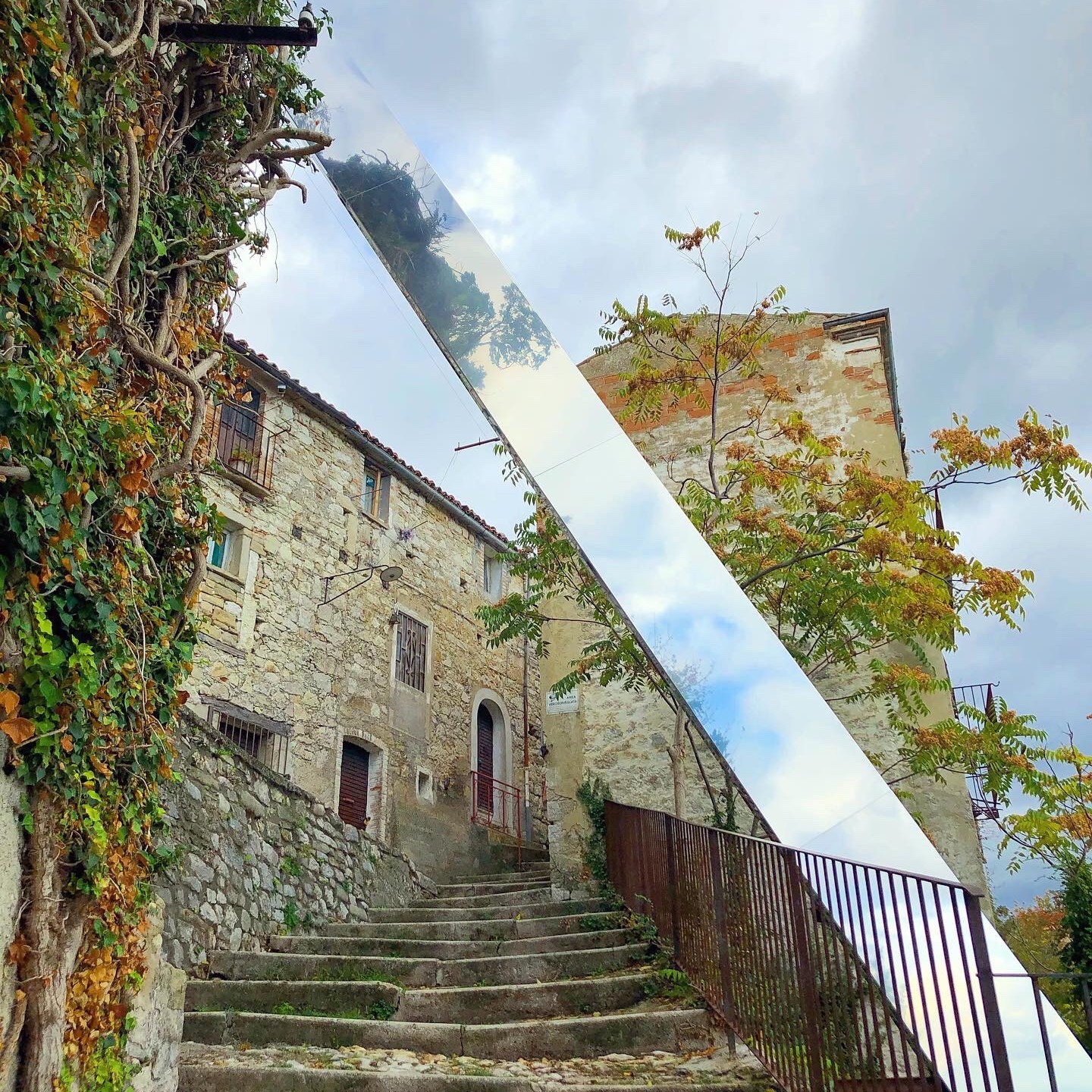 Salendo la gradinata che precede il borgo, si scorge subito l’opera antesignana dell’intero percorso creativo che, in tutto il suo splendore, da il benvenuto ai visitatori: è BN_L_AIFE_20_295 di Artan Shalsi che, attraverso “la restituzione di un gioco di immagini riflesse, catapulta il visitatore in una dimensione spazio-temporale evocativa e suggestiva”. Questo elemento inclinato fatto di specchi, come una sorta di pilastro diagonale, oltre all’estrinseca valenza artistica ha anche un’intrinseca valenza strutturale dato che sostiene realmente l’edificio su cui si addossa.