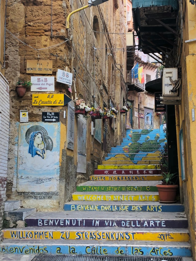 Andando in direzione opposta si raggiunge invece la città di Favara, famosa per il Farm Cultural Park, un centro culturale indoor e outdoor nel cuore del centro storico. Io di Farm Cultural Park mi invaghii qualche anno fa quando, ad una conferenza di architetti e tra architetti, sentii parlare per la prima volta di questo progetto divertente e dinamico che provava a tirare su le sorti di un centro storico abbandonato e decadente nel cuore più vero e più crudo della Sicilia. Beh, ora che l’ho visto con i miei occhi direi che ci sono riusciti benissimo! Un museo a cielo aperto, e non solo, un incubatore culturale e un luogo iconico ed ironico che desta ammirazione. Una città nella città di cui, ca va sans dire, me ne sono innamorata perdutamente. Mostre, opere d’arte, street art qua e là e gente del posto che ha a cuore il progetto indaffarata ad esplicare ogni significato intrinseco. Un vero approdo felice per una mente artistica ed architettonica come la mia, nonché il motivo principale della mia visita in Sicilia insieme al Cretto di Burri [ sì, ero da tempo troppo curiosa di visitare questo sito per così dire artistico!!! ].