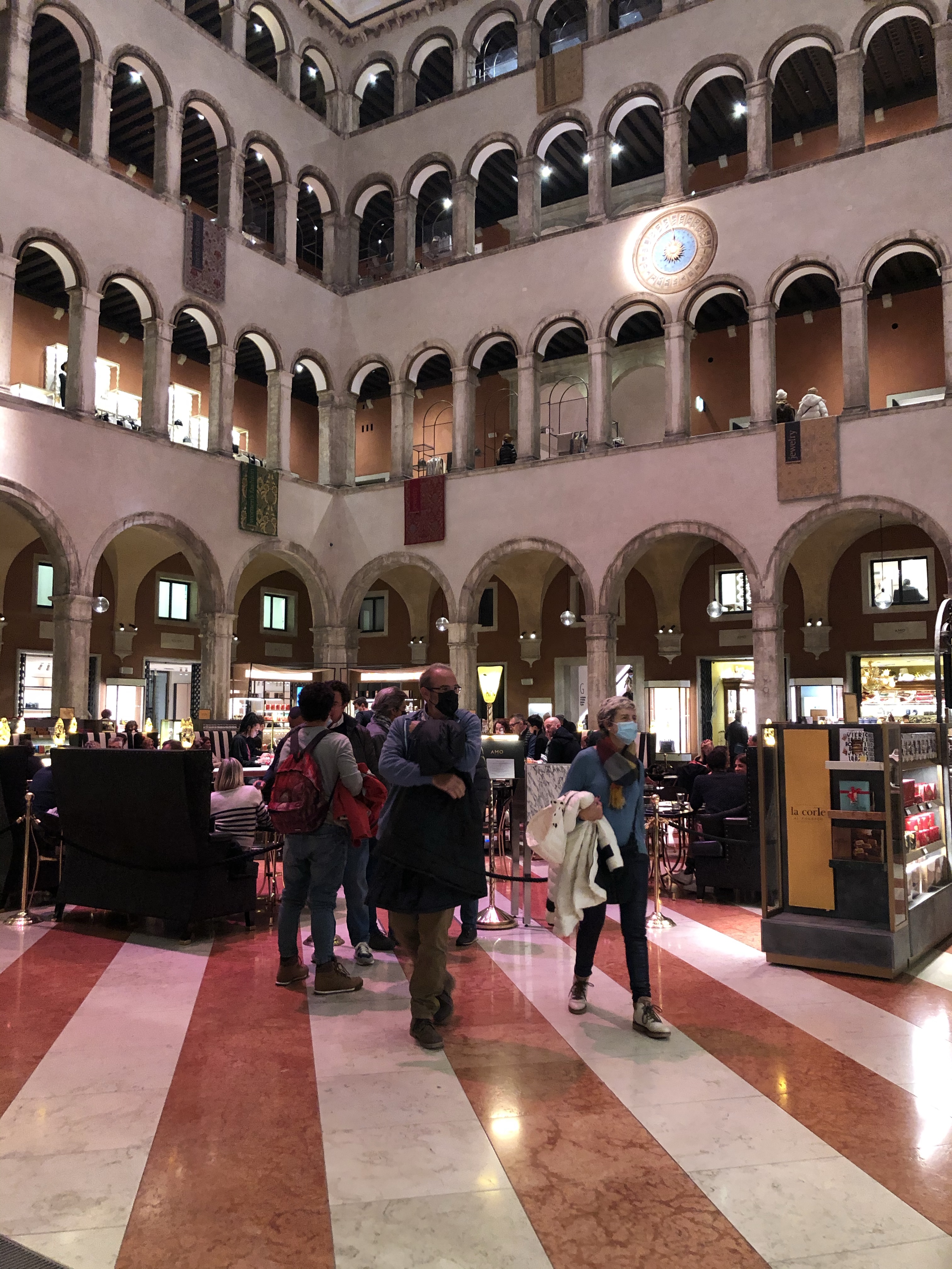 Nella direzione del Ponte di Rialto, splende il palazzo che prima ospitava le Poste e ancor prima un magazzino dei tedeschi, oggi noto, appunto, come Ex Fondaco dei tedeschi: un esempio di archeologia industriale rifunzionalizzato grazie alla conversione in magazzino di lusso, su progetto dello studio di architettura olandese OMA, con terrazza panoramica che vanta una vista a 360 gradi su tutta la città [ l’ingresso alla terrazza è gratuito ma con prenotazione online ].