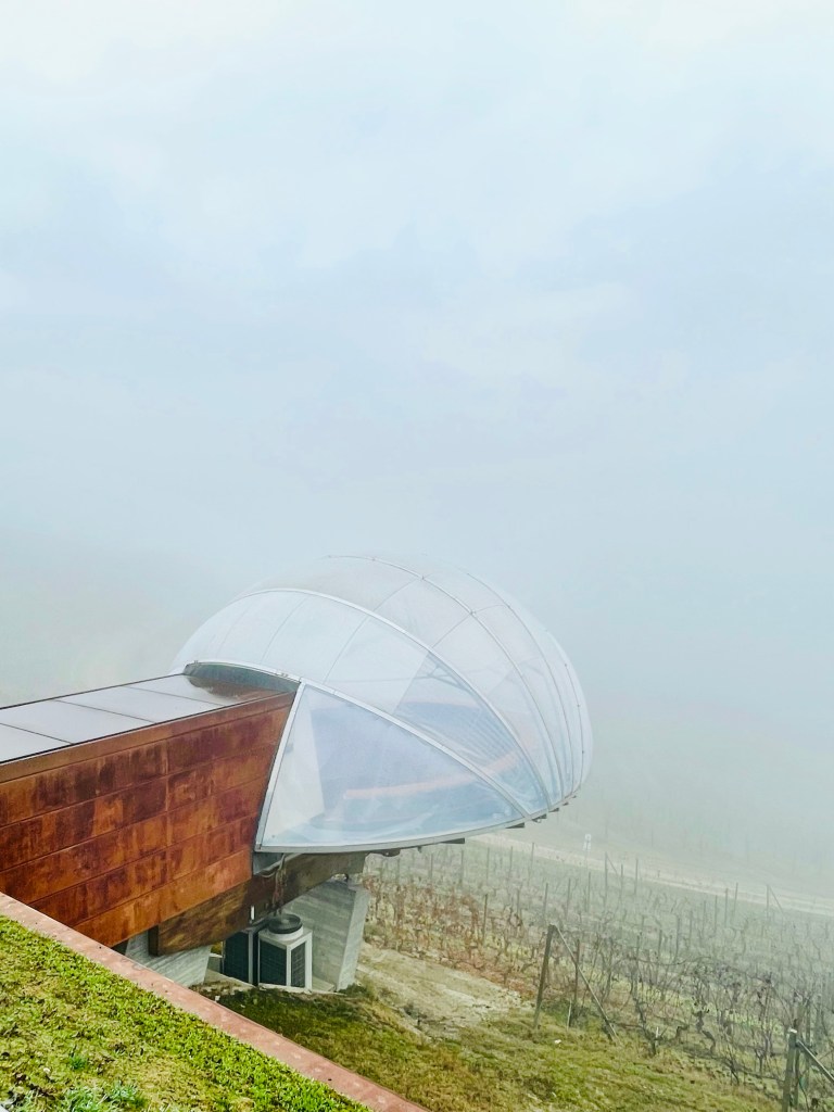 La Cantina Ceretto, forse la più blasonata e sicuramente la più stimata della zona, gode di una vista privilegiata sui vigneti più scoscesi che attornano la città di Alba. Nota non solo per la qualità dei suoi vini, ma anche per la bolla vetrata sospesa sulla collina [ il cosiddetto Acino ] che sbuca dalla cantina prevalentemente ipogea, ha fatto la storia del Barolo e non solo, grazie alla sua esistenza quasi centenaria e alla sua attenzione all’ambiente e alla qualità grazie ad un progressivo lavoro di sottrazione. Le visite e le degustazioni avvengono solo su prenotazione [ a partire da 60 € a persona ], mentre il loro punto vendita è regolarmente aperto ogni giorno, al netto delle ferie. Il progetto di restyling di questa antica cascina del 1800, che ospita la sede principale dell’azienda, è stato curato dallo Studio Architetti Deabate, che ha progettato nuovi spazi produttivi ed espositivi ipogei e la sala ellittica che fuoriesce dalla terra affacciandosi sulle vigne circostanti.