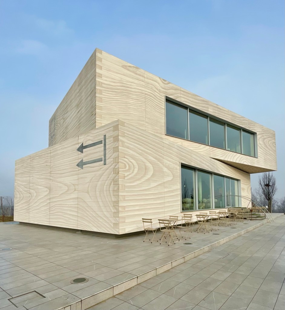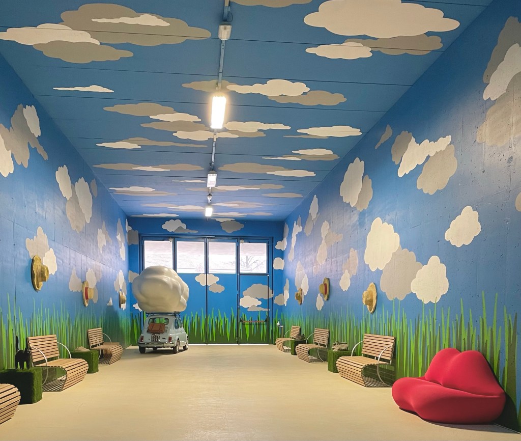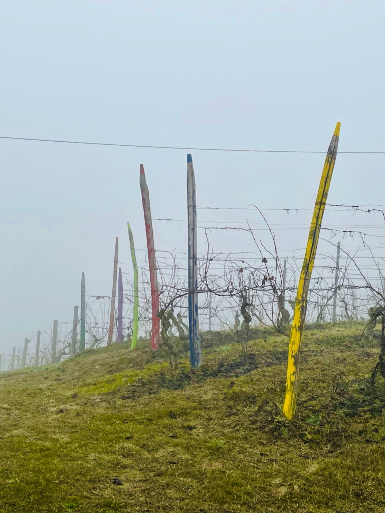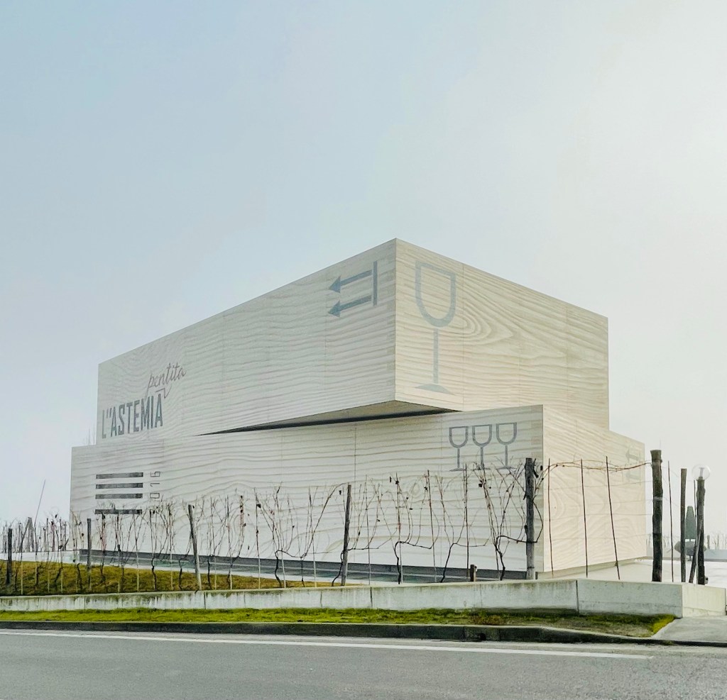 L”Astemia Pentita è una cantina fresca, giovane, innovativa, super wow e sostanzialmente pop che coniuga tradizione e innovazione in un involucro originale [ due cassette di legno, che in genere contengono i vini, sovrapposte ] che non passa certo inosservato. Eloquente, ironica e provocatoria, merita una visita [ da prenotare sul loro sito o telefonicamente con largo anticipo, con un costo che parte da 25 € a persona ] che permette di entrare nel cuore produttivo ipogeo, tutto allegramente dipinto a mano nel rispetto della stagionalità delle varie fasi produttive, e nel sapore voluttuoso dei suoi vini, grazie alla degustazione conclusiva del percorso di visita. Il progetto, che oserei definire iconico proprio come la sua proprietaria Sandra Vezza, a capo anche della celebre azienda di design Gufram, è del creativo architetto Gianni Arnaudo, in stretta collaborazione con la stessa proprietaria. Iconiche sono anche e soprattutto le sue bottiglie dalle forme spiccate, sinuose e particolari. Il packaging diventa protagonista, nell’edificio così come nelle bottiglie, forse proprio per sintetizzare in maniera emblematica l’essenza del mondo d’oggi, dove spesso il contenitore conta più del contenuto. Curiosità senza troppi spoiler: la proprietaria è astemia! Ecco quindi perchè la cantina si chiama così.