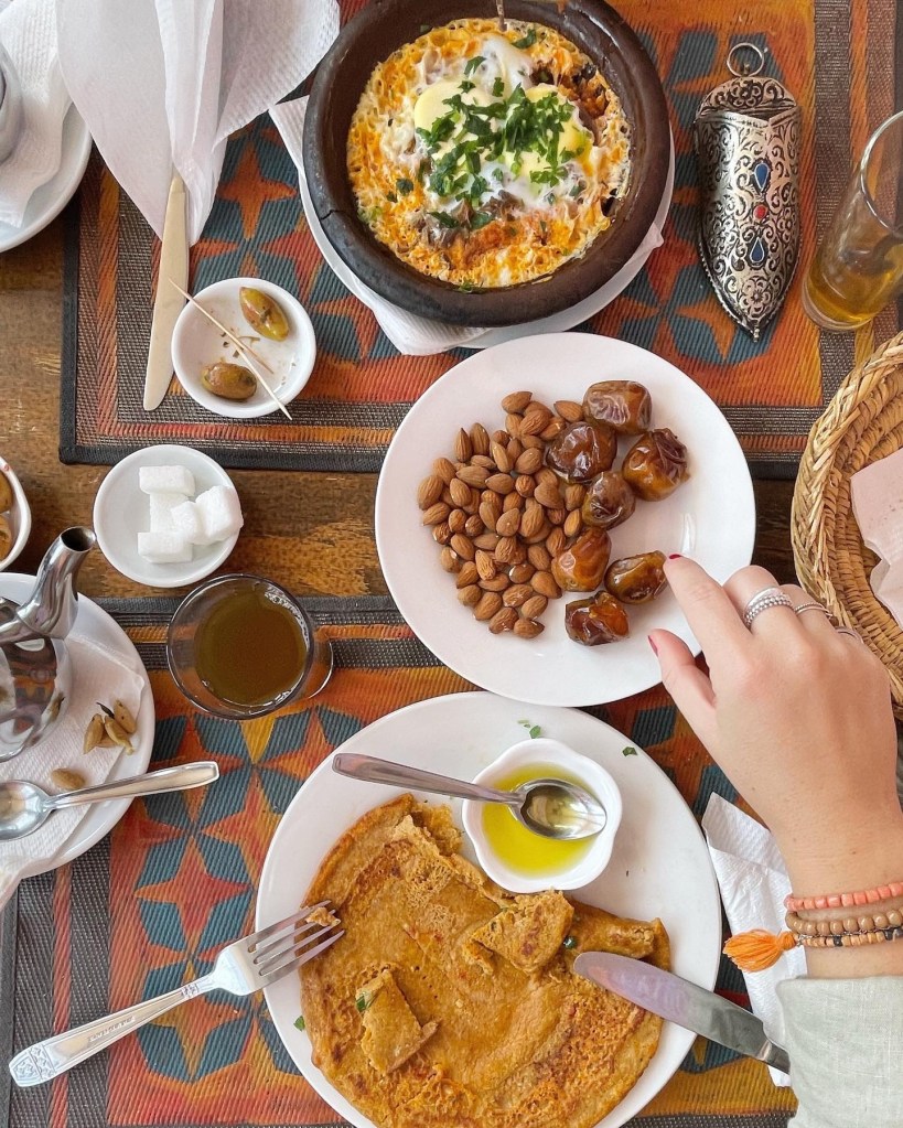 Ma passiamo alla mia parte preferita: il cibo. La cucina marocchina è gustosa, succulenta, mediterranea, colorata e genuina. Basta pensare a quella calda delizia rinfrescante del tè alla menta che viene propinato a tutte le ore rigorosamente zuccherato; ai datteri freschi, alle olive, alle verdure che cospargono la cupola di cous cous nella tajine; al miele, al pane soffice, alle spezie. Ecco dove assaggiare queste semplici delizie.